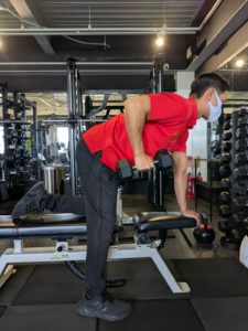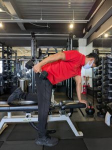 ②ダンベルを持っている方の脇を締めて、上腕(肩~肘)が床と平行になるようにして、肘を曲げる