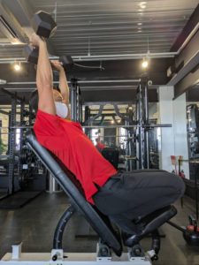 ①肘が後方に流れないように意識して、ダンベルが後頭部付近に来るように肘を曲げる