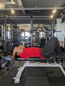 ①ベンチに両足を乗せ、膝を曲げて踵にお尻を乗せるようなイメージで座る